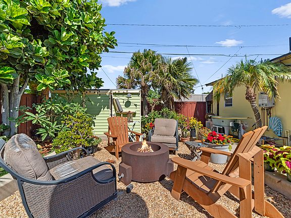 Gas fire placeBeach cottageLarge side yardLots of palm treesBeach style landscapeUpgraded windows and skylightsNatural light