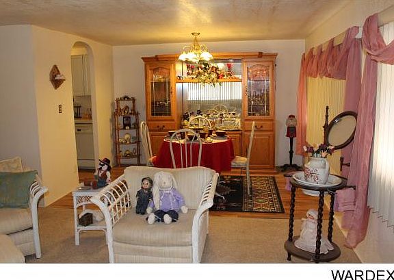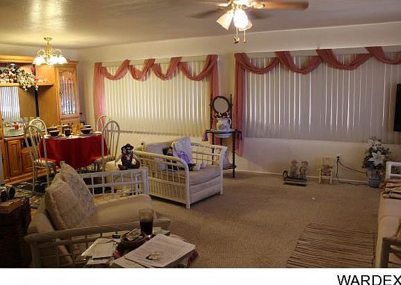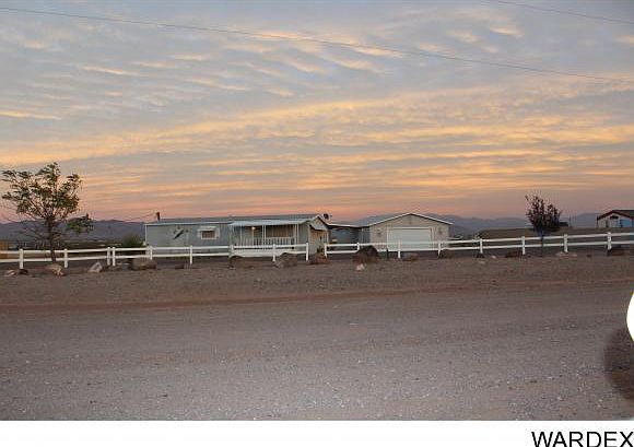 Completely remodeled triple wide. 2 bedrooms, 2 full baths plus enormous room measuring 12ft x 48ft. Detached boat deep garage, fully fenced, circular driveway, panoramic mountain views. New roof, extra insulation with window sun shades and ceiling fans. Horses allowed. 17 miles away from both Kingman and 17 miles away from Bullhead City. Property moved from its original location and completely remodeled. However, the move disqualifies it from some loans.