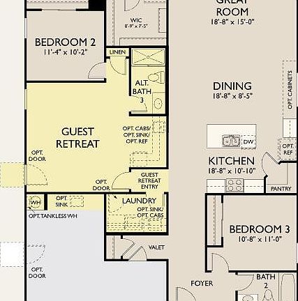Lovely Modern Desert elevation with our most popular Sage plan with the guest retreat option. This home is nicely appointed with 8 foot doors. The kitchen has a built in wall oven and microwave, granite kitchen counters, and painted kitchen cabinets with 42'' uppers. Upgraded wood plank tile floors in all the main living areas with upgraded carpet in the bedrooms, while the guest suite is nicely appointed with lower cabinets and a sink. Many upgrades in plumbing and electrical bring this homes design together for a lovely home to move into quickly.