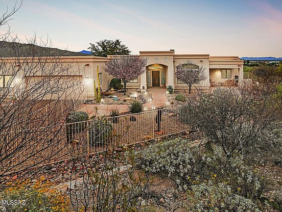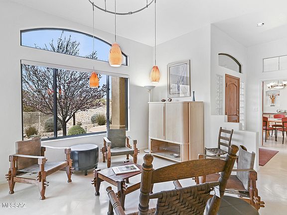Custom SW Contemporary,located on a spectacular 4.37 acre ridge-top lot. Enjoy expansive 360 degree views. Lovely gated courtyard & beautifully landscaped yard w/specimen cacti. The thoughtful design of this home shines through. Each room enjoys outstanding views. Split bedroom plan ensures privacy. Color infused concrete floors & quartz counter tops add SW elegance. Formal dining room w/ built in buffet & display niches. Flex-living/office/den offers many possibilities. Great room: beehive gas log fireplace, high ceilings & views! Master-suite is grandly proportioned, features jetted tub & sep. walk in shower. Expansive covered patio is the perfect place to watch the rising of the moon & sunsets hues on the mountains. Bay 3 in garage is a bonus room: heated & cooled w/sink. Studio