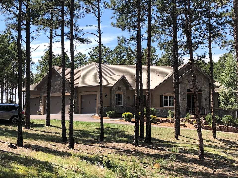 Beautiful stucco & stone former model home loaded with extras nestled in the tall pines and beautiful meadows! The home features amazing woodwork & trim throughout! Gourmet kitchen w/commercial GE Monogram range, double ovens and enormous pantry. Master suite w/his & hers closets, thoughtful laundry room access and private deck. Main level bedroom/office with fireplace walks out to deck and gas fire-pit. Sunny, walk out basement inviting tall ceilings, wet bar, & whole house audio/video system. Backyard landscaped with stamped concrete and gas fire-pit. Oversize 4 car garage. Deck prepped for hot tub. 3 fireplaces ~ two are see through. New paint and carpet through out entire house. Beamed ceilings and gorgeous wood trim and stone accents in great room. Custom window coverings and valances. Garage is oversized and epoxy coated w/storage nook and shelves. Fire mitigated lot. Wonderful neighborhood with ponds, Community center and miles of walking trails. District 20 schools.