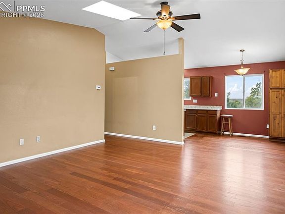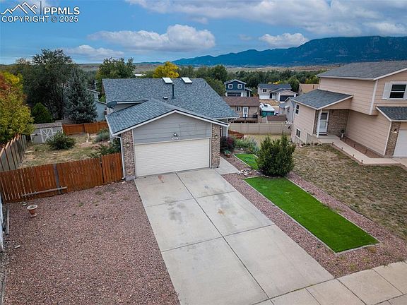 ***See the Amazing Video at the Virtual Tour Link on the listing*** Welcome to this beautifully maintained bi-level home in the desirable Security-Widefield area, offering a perfect blend of comfort, charm, and stunning Pikes Peak views. Step inside to the entry level featuring a bright window, convenient garage access, and an easy flow into the main living spaces. The upper level boasts vaulted ceilings, wood floors, and skylights that fill the home with natural light. The kitchen features stainless steel appliances, a pantry, and stylish tile backsplashes in the bathrooms for a modern touch. The lower-level family room offers the perfect gathering space with a cozy gas fireplace and French doors that open to the backyard. Outdoor living is at its best here — enjoy a large deck, expansive paver patio, and a terraced, fully fenced backyard complete with a storage shed. The artificial turf front yard provides great curb appeal with low maintenance, while the extra-long driveway adds ample parking space. Located close to parks and schools, this home combines functionality with inviting style — ideal for those looking to enjoy Colorado living with mountain views right from their doorstep.