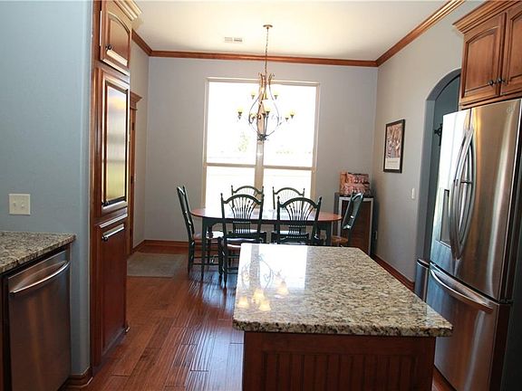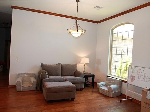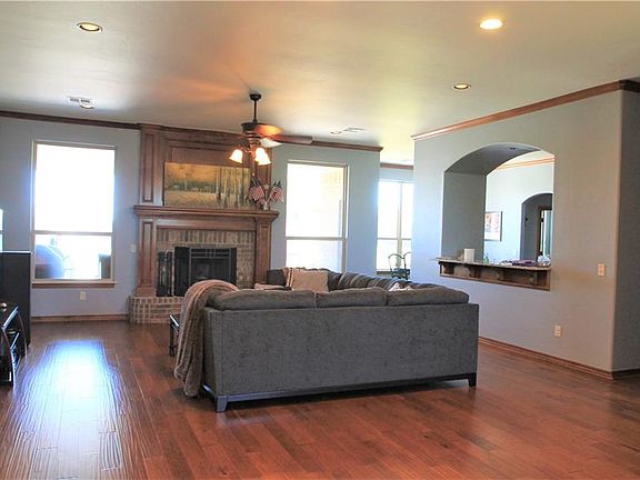 Sweeping Front Entrance. Wood floors in main living areas and 4th bedroom/office walk-in closet. Ceramic floors in bath areas. Large secondary bedrooms most with walk-in closets, or double closets. Enormous walk-in pantry shelving up to 8'. Two deep storage cabinets in kitchen perfect for extra kitchen appliances(bread maker, Free standing mixer etc.) Mudroom bench with upper cabinets and lower drawers. The place to leave shoes backpacks and purse. Bricked gas fireplace a focus point for living room and ample amount of crown molding. Most homes need storage this home has it. Large linen closet in main bath. The main bath closet is huge with a built-in dresser. Shoe racks. Large covered back patio. Wood fenced back yard solar lights on fence. Firepit will feel better this winter. entertain outside year around, wall-mounted TV. Ceiling fan. Room for grills/smokers. Storm shelter in garage. 12x20 backyard storage building. Morton style steel buildings allowed. Buyer to confirm schools.