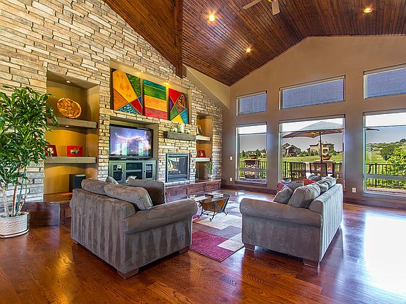 Ideally Located on Over an Acre on a Quiet Cul-de-sac, Overlooking Fairway & Surrounding Country Side. Extensive Landscape, Ideal for Outdoor Entertaining. Multiple Patios, Massive Covered Deck, Water Feature & Fire-pit. Stunning Architecture, Opulent Wood Floors, Tongue in Grove Ceiling w/Large Beams, Massive Stone Mantel w/Art & Media Niche. Spacious Kitchen w/Two Tone Alder Cabinets, Integrated Refrig, 6 Burner Gas Stove w/Pot Filler, Stainless Steel Vent System w/Custom Tile, Double Oven, Vegetable Sink & Granite Counters. Nicely Appointed Master w/Fireplace Retreat, Views, Deck Access. Luxurious Master Bath w/Large Jetted Tub, Stone Fireplace & Large Windows. Formal Dining, Tile & Wood Floors, Custom Lighting. Main Floor Study w/Beam Ceiling, Built-ins & Custom Floor Accents. Lower Level Family Rm has Wet Bar, Microwave Dishwasher Stone Mantel & Media Niche. Media Rm has Room for Gaming Tables & Large Drop Screen w/Projector & Surround Sound. Mudroom w/Built-ins. See Virtual Tour.