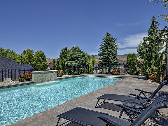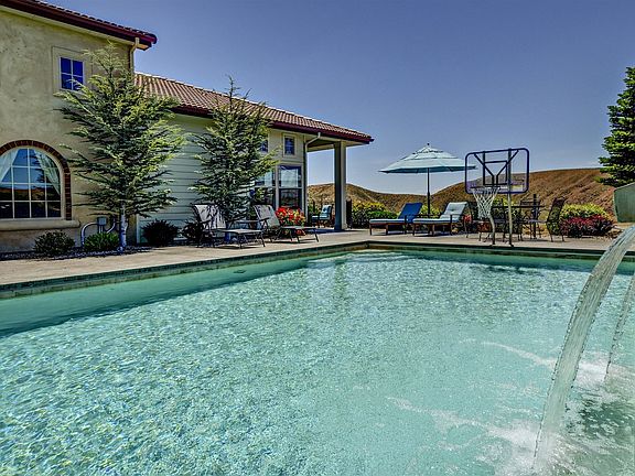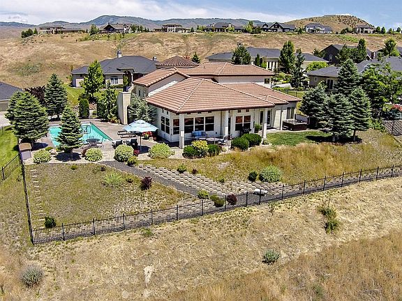 Modern Mediterranean former parade home with over an acre, salt water pool (with automatic safety cover and sheer waterfall) & breath taking views! Entertainers Dream with two story turret, extensive windows with beautiful light, 3 large bedrooms plus an office or 4th bedroom, 2 indoor fireplaces, & a private courtyard with fireplace. Open floor plan & formal dining room that leads to your backyard paradise. Kitchen features granite counters, newer tile backsplash, custom cabinets & SS appliances.......