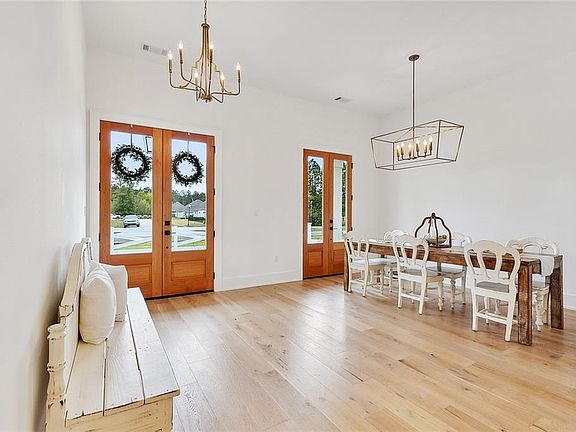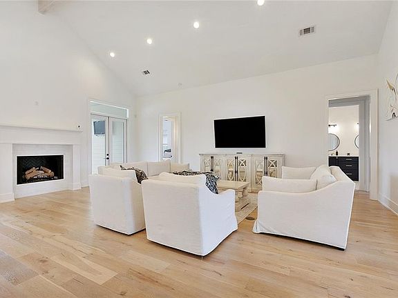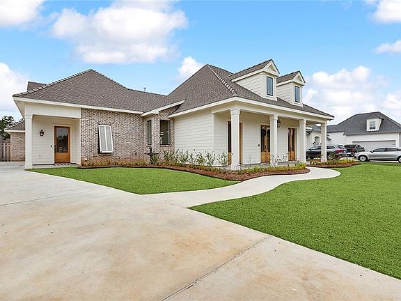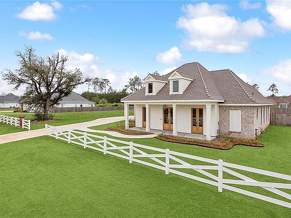 Elegantly designed Acadian, Custom built on 1/2 acre lot in Bedico Creek. 4 bedrooms 3 1/2 bathrooms plus upstairs Bonus room. French doors on front of home lead to an inviting front porch overlooking greenspace, ponds and golf cart trail. Inside you are welcomed by an open concept floor plan with wide plank wood floors, great for entertaining! Living room features vaulted ceiling with wood beam accent and gas fireplace flanked by French doors to the rear patio. Chef's dream Kitchen with GE Cafe appliances, built in refrigerator/freezer, marble counters, corner sink, custom cabinets, tile backsplash, beverage cooler, walk in pantry with custom crafted door. Retreat to the Primary suite with tray ceiling & custom crafted double doors leading to spa-like ensuite featuring free standing tub, walk thru shower, separate vanities and large custom designed closet. On the opposite side of the home you'll find 3 guest bedrooms, one with private ensuite, plus an additional bathroom with double vanity & large tile shower- Quartz counters. Side entry access to mudroom with built-ins. Oversized patio with wood ceiling. Massive rear yard with gate access that leads directly to golf cart path. Extended driveway for rear yard vehicle access. Whole house Generator. Landscape lighting & irrigation. Media closet. Walk-in attic access. Bedico Creek offers 2 pools with open air pavilions, 3.5 miles of concrete trails, nature trails, hundreds of acres of greenspace & nature preserve, disc golf course, fishing pier + more!
