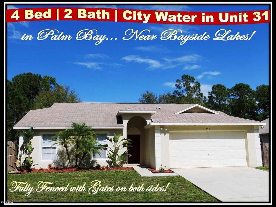 Great Floorplan Design in this 4 bedroom, 2 bath, 2 car garage home in Unit 31 of Palm Bay. This home is concrete block with stucco & offers City Water. Features include: Tile foyer, Brand new carpet throughout, new interior paint, nice vaulted ceiling throughout with many decorative plant ledges.Enjoy the spacious family room that is open to the dining room & Fully equipped Kitchen with breakfast bar & quaint nook space, & pantry. Nice master suite, master bath offers dual sink vanity, garden tub & separate shower. Enjoy Privacy wood fence with gates on both sides of home & Child Playset included.Other features: Indoor Laundry Room, Garage door opener, tankless water heater, recently installed a/c, patio off slider from family room,xtra shelves /cabinets in garage & much more, tour today.