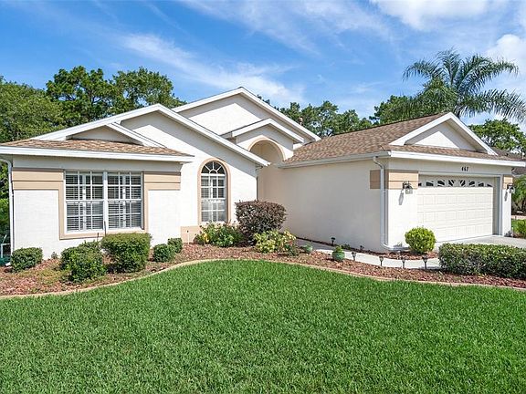 Located in the Beautiful Community of Wellington at Seven Hills, which offers 24-hour maned, gated access to this 55+ community. This 2 bedroom, 2 bath home with an additional den/office, backs up to a beautiful backdrop of lush trees and landscaping for privacy with no rear neighbors. It's also located on a quiet cul-de-sac. As you enter through the front door, you are greeted with a large Great Room with a vaulted ceiling approx. 14 feet at the center, all neutral colors, plant shelves and transom windows above the pocket sliders which open to the Spacious Florida Room. This space offers both Heat and Air for an additional 285 square feet: measuring approx. 20x15 with beautiful tile floors. Floor to ceiling windows which allow for great views of the green space. There are also pulldown shades for privacy. Just off the Great Room is the kitchen with separate dinette area and breakfast bar. Lots of cabinetry, plus a walk-in pantry with ample shelving. The adjacent laundry room with full size, front load washer and dryer offers additional cabinetry. The many upgraded features of this home include plantation shutters and beautiful luxury laminate flooring throughout, with tile in all the wet areas including the kitchen. The spacious master bedroom with walk-in closet offers sliders that open to the Expansive Florida Room. The master bath features a dual vanity with walk-in shower. Also, just outside the Florida room is a new paver patio for additional space for grilling. The garage measures 26x21 and features built in shelving for extra storage plus a pull-down ladder for access to attic with plywood for more storage. Newer Roof in 2015, New Garage Door in 2014, Water Heater 2018, AC 2013, Refrigerator 2018, Dishwasher 2018. Enjoy the many features the community clubhouse has to offer including the Bar n Grill, heated pool, fitness, library, billiards, tennis, pickleball, dozens of classes, clubs, and social events. Loads of local area activities to partake in including fishing, kayaking, great restaurants, fun day trips to discover areas like Crystal River or Homosassa for Scalloping or to see the Manatees at the Natural Springs. The Veterans Tollway is close by and offers Easy Access to Tampa or St Pete! And Tampa Int'l Airport is just 45 mins away. Stop by to see this beautiful, well-maintained home today.
