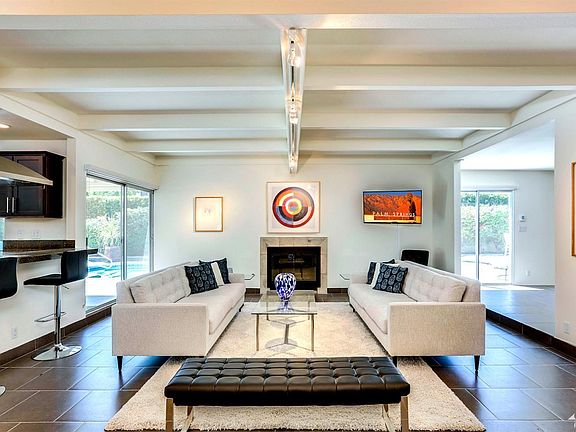 Location, lifestyle and beauty - yours in this dramatic open architecture mid-century remodel. This exceptional 3bd/4ba Sunrise Park home is located on a quiet, tree shaded residential street, just minutes from the best of everything Palm Springs has to offer. Enter the custom double doors and this home captivates you with light, modern spaces. Raised beam ceilings run the length of the great room into the spacious, expansive den. Tile flooring throughout, upscale bathrooms and a master suite that is open, airy and filled with light. The kitchen space is clean and smart, where form follows function with granite countertops, custom cabinetry and breakfast bar. Outside enjoy the private backyard with custom desert landscaping, lighting, sparkling pool, spa, and entertainment area, plus the ambiance of an expansive covered patio with mountain views. This home has the finest finishes in a pristine palette that will last far into the future.