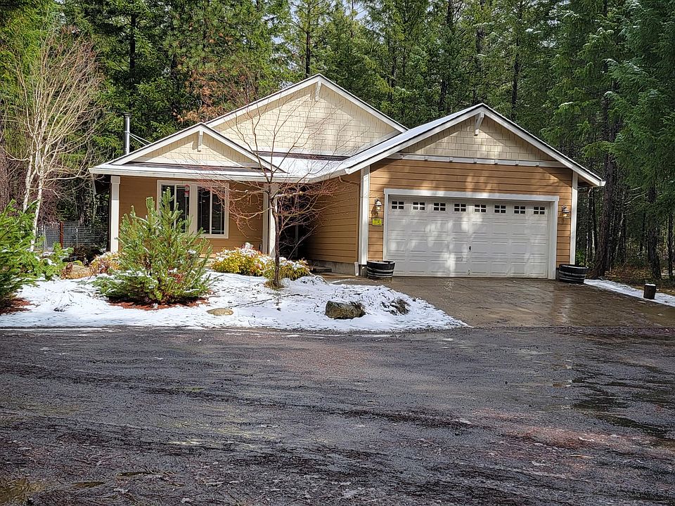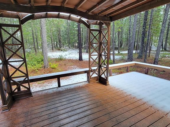 Fantastic home in the woods on 5 level acres. Open floor plan with laminate flooring. Nice open kitchen/dining and living area with wood stove. Sliding glass (pet door) to outside. Windows provide plenty of light. 2 car garage, laundry room and plenty of wildlife. What a bonus the underlying VA loan can possibly be assumed at a 2.75% interest rate. Large kitchen island, dishwasher, stove and refrigerator all included. Attractive gazebo off the main suite for summer entertaining or relaxing. Some landscaping has been done. Newer home built in 2011.