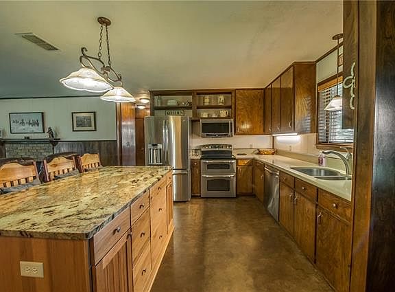 Beautiful 40 acre property with upgraded kitchen includes granite counters with a grand island. 3 bedroom 2 bath ranch house offers views overlooking the stocked pond with quick access to the Garage with covered RV port with 50 amp hookup and water. Includes a Cattle barn and separate workshop. Boasting views from several hilltops covered in native grasses that are fenced, cross fenced and will allow for various livestock grazing or hunting.