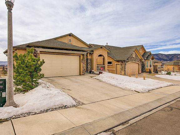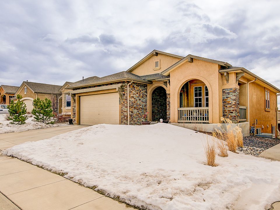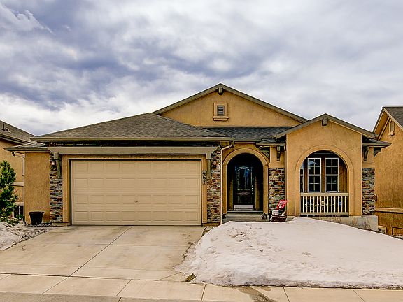 Jackson Creek stucco and stone rancher with very nice covered porch. Step into an inviting hardwood floor entryway. The open floor plan provides lots of natural light and features a great room with cozy corner fireplace. Walk out to the Trex deck to relax and enjoy the breathtaking unobstructed views of Pikes Peak, Air Force Academy and the Front Range. Spacious kitchen offers sunny nook area, large pantry, breakfast bar and like new GE Slate appliances. Retreat to the Master Suite with 6 ft. soaking tub, separate tiled shower, and huge walk in closet. Downstairs is fully finished with Large open family area, two additional bedrooms, full bath, and shelved laundry room. Walkout to the patio and professionally landscaped backyard complete with fire pit. Many extras including Central A/C, Generac whole house back up generator, Oversized insulated 2.5 car garage with custom shelving, Gas line to deck for grill hookup, Auto Sprinkler system, tons of storage! Excellent location on a quiet cul-de-sac street. Easy access to I-25. Walking distance to grocery,shopping center and restaurants. Walking trails near by. This Move-In Ready Stunner shows like a model and is a MUST-SEE!