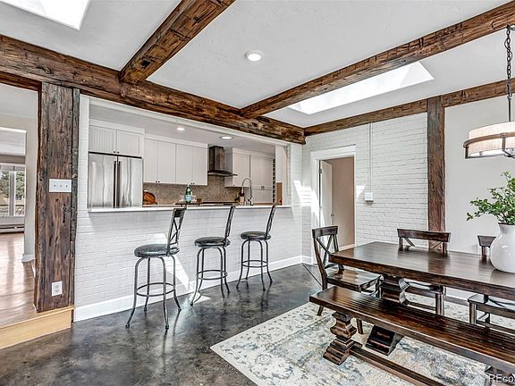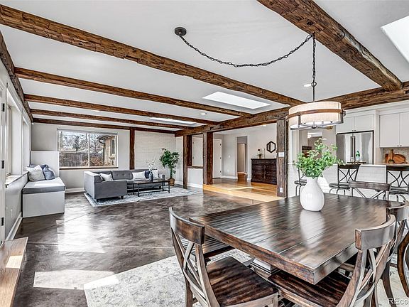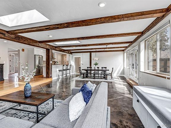 Magnificent home with beautiful updates, hardwood floors and custom exposed wood beams all while sitting on over half an acre lot just minutes to Olde Town Arvada. This sprawling ranch home offers plenty of wow factor as you first drive up the circular driveway with ample well established trees and garden beds. Inside you are immediately greeted by an open living room centered around a cozy wood fireplace. You will love entertaining in your recently updated kitchen with stainless steel appliances and quartz counters overlooking your expansive luxurious, light and bright sunroom with its large windows and radiant heat floors! The primary suite offers a relaxing retreat and a meticulously updated primary wet room with tile floors, deep soaking tub and walk-in shower. The three secondary bedrooms offer ample space and share a large bathroom with beautifully tiled shower. The 4th bedroom also makes for a great study with winter mountain views and French doors that open to the living room. Don’t miss the huge laundry/mud room off the garage entry with the attached powder room! When you have over a half-acre, there better be some wow factor from the yard and this home certainly has it. The sunroom leads you through another set of French Doors out onto a large flagstone patio with plenty of greenery in your backyard, including large wood burning fire pit for those cool Colorado evenings. Don't miss the exterior woodshop with electricity and attached storage shed for all your outdoor tools and wood! There is also a lovely garden area with raised beds so you can cultivate your own crops! Only minutes to popular Olde Town Arvada with easy access to I-70 and the Rocky Mountains! This home is a truly unique find and will knock you out with its charm, so don’t miss it!