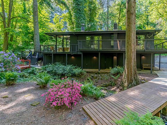 Frank Lloyd Wright inspired architecture on 1-acre private oasis! Truly one-of-a-kind home w/floor to ceiling windows in the dining & step-down living room, private sliders to deck off of each bedroom, primary w/walk-in closet & fully remodeled ensuite & main bath, new flooring, newly finished lower level w/add’l office! Attached workshop w/electrical. Outside you'll enjoy the year round creek, add’l seasonal creek, 2 footbridges & abundant wildlife! See att'd features list. Must see to fully experience!
