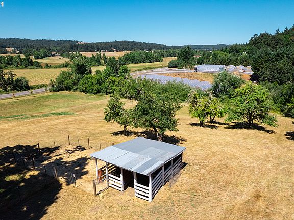Great opportunity to own small acreage with amazing views of the valley & coast range. 5 usable acres w/ 2 pastures, large open concept barn, smaller animal barn, 21 x 28 heated shop with 220, RV parking with hookups, seasonal creek, two orchards, chicken coop (chickens included!) & a large BBQ smoke house. Classic 1920's home with 9' ceilings includes new laundry room, updated kitchen & bathrooms, newer light fixtures and hardware, laminate flooring & 4 year old high efficiency Jotul wood stove