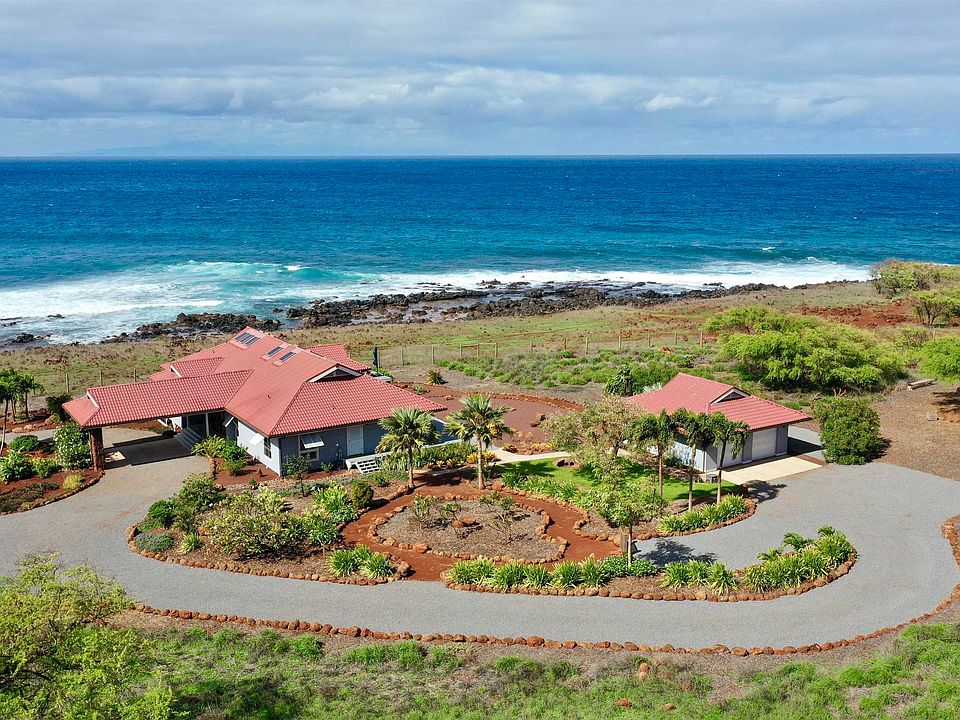 Located on the sunny West End of Molokai with sandy beaches and expansive ocean vistas of Oahu and Diamond Head, this fully furnished Hawaiian style beach house sits on 6+ completely fenced and gated acres with 496 feet of ocean frontage. The driveway to the house is lined with over 50 foxtail palms leading to the porte-cochere or the matching two car detached garage. This very well-maintained, turn key home features beautiful 20’ open beam ceilings with 10 remote operated skylights, spacious rooms with a view of the ocean, and 20’ of bi-fold glass lanai doors creating a seamless connection to the island experience. Surrounded in island influenced low maintenance landscaping on automated irrigation, the wrap around decking, therapeutic spa and large lanais invite you to enjoy the waves, watch the indescribable sunsets or follow the short trail to the secluded beach and take a dip in the sandy bottomed tide pools.