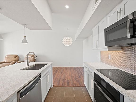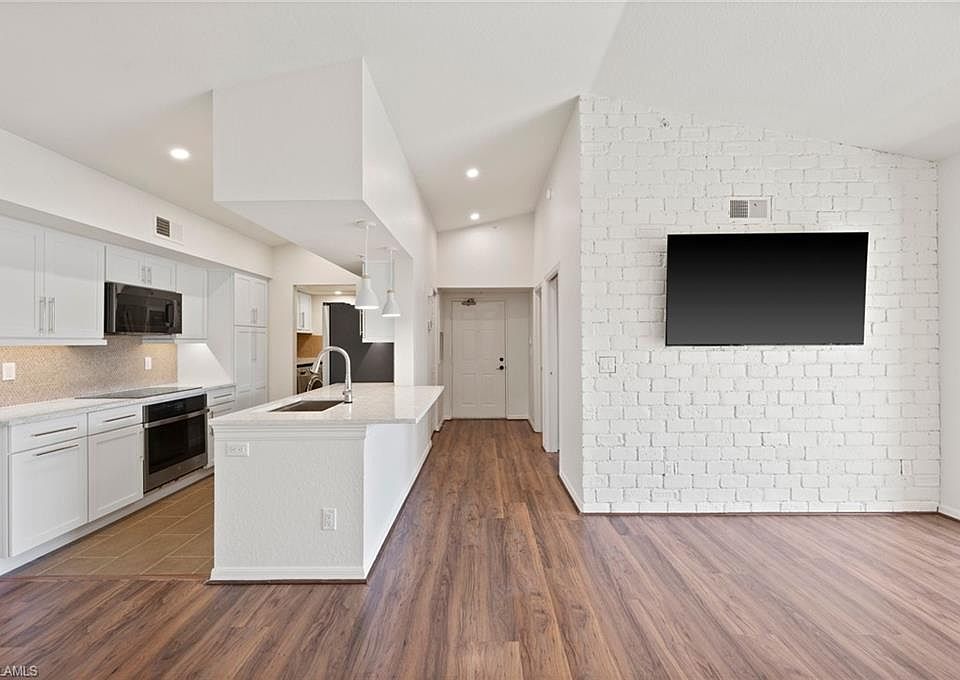 Discover your ideal N. Naples retreat in this tastefully renovated 1-bed, 1-bath condo uniquely appointed with a 1-car garage. This urban oasis offers a harmonious blend of comfort, style, & practicality, making it the perfect place to call home in beautiful North Naples. As you step inside, you'll be greeted by a thoughtful layout that maximizes functionality and style for the professional, or snowbird; vaulted ceilings, new LED lighting, and brick accent wall that gives the perfect touch for an urban-modern design. The brand new kitchen is a standout feature of this condo, featuring all new soft close cabinetry with pull out drawers, elegant quartz counters, new electric cooktop and GE Profile oven. Quartz counters flow beyond the kitchen into the laundry room creating the perfect folding space above the new front loader washer & dryer. Your private bedroom offers ample closet space and access to the modern bathroom which is a spa-like haven that's sure to elevate your daily routine to a luxurious experience. This exceptional space paired with an ideal N. Naples location makes this the perfect place to call your vacation, or year round home.