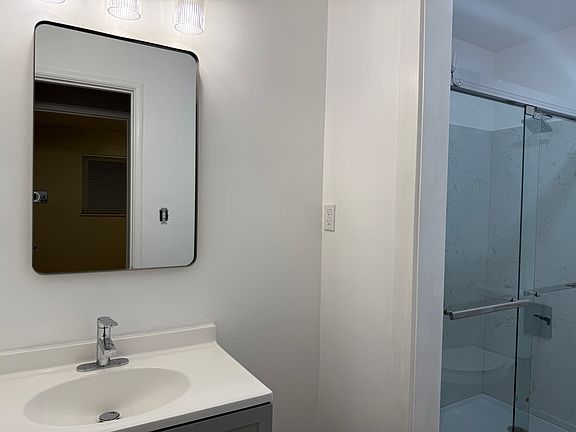 Modern fixturesGooseneck faucetBright and modern unitShaker style cabinetsQuartz countertopsNewly renovated bathroomNew lvp flooring throughout