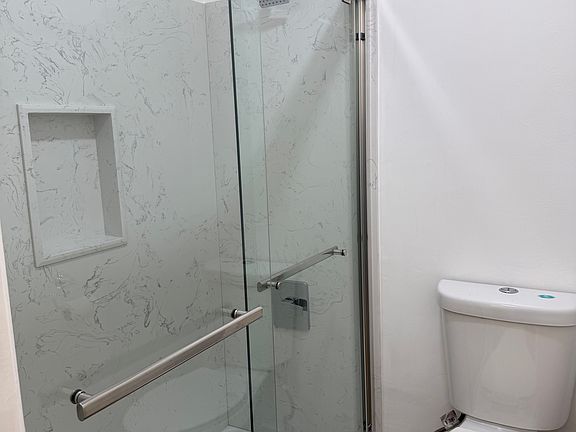 Newly renovated bathroom with modern fixtures and easy to clean slab shower walls