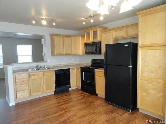 Excellent condition with new carpet and luxury vinyl floors. 3 bedroom 1.5 bath home. Features a large kitchen with maple cabinets, upgraded light fixtures, pantry, large eating area, breakfast Nook, all black appliances include refrigerator, stove, microwave & dishwasher. Living area with gas fireplace, warm earth tone paint and entertainment nook. Master bedroom with generous size walk in closet. Detached 2 car garage with plenty of storage space . Unfinished basement. Fenced in back yard, Large Covered Deck. Resort Style Community Swimming Pool and Beach Club includes hammocks for lounging. Community Park with water fountains to play in! Extra storage closet. Easy access to I 76 ,E470, Hwy 85, close to airport. Only 25 minutes to Downtown Denver, 20 minutes to DIA, perfect location! Please check square footage and HOA information.