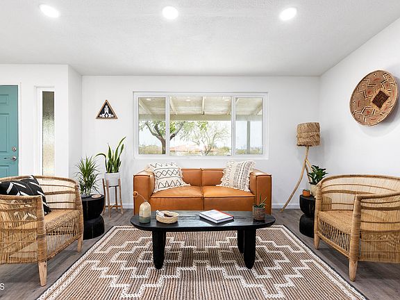 4672 Avenida Del Sol sits on nearly half an acre in Northern Joshua Tree, surrounded by mountain views. Step into a light filled open living space with new flooring, ductless mini-split, and a charming pellet stove. The fully remodeled kitchen is equipped with new stainless steel appliances, and the dining area opens onto a large covered patio, giving you that indoor-outdoor flow. Two spacious bedrooms and an updated bathroom round out the living space, while an attached two car garage provides parking and storage, or has potential to be converted into a great bonus space. The west facing backyard is perfect for enjoying beautiful desert sunsets and includes a hot tub, hammocks, and fire pit. 4672 Avenida Del Sol is located just a short drive from the national park and a few minutes away from local favorites like Joshua Tree Brewery, Natural Sisters, The Dez, and Crossroads Cafe.