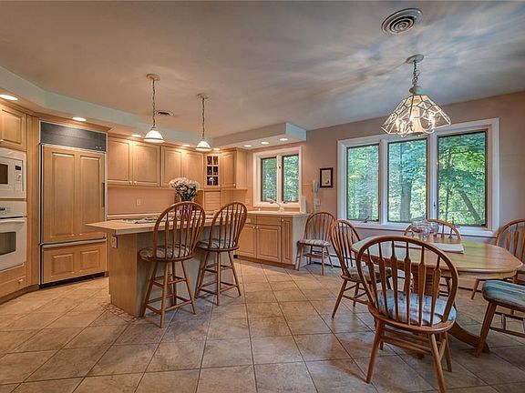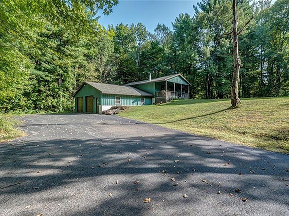 What? Almost 10 acres with a HUGE 3+car garage/workshop in the country but located minutes from shopping & highways! Custom built home on 4.2 acres with an extra 5.5 acre lot. You can't see it from the road because it is nestled back in the woods. This home has 2 bedrooms with an option for a 3rd on the lower level. Quality built Woodmode kitchen with Subzero fridge & Thermador cooktop has walls of windows overlooking the PRIVATE yard. You'll see turkey, deer & plenty of wildlife right from your dining table. The vaulted living room with gorgeous stone fireplace open to the kitchen leads out to the front porch overlooking the private yard. 2 bedrooms both have slider to a porch overlooking the peaceful forest. Waking up to this will make you happy! Hot water heat and forced central air.