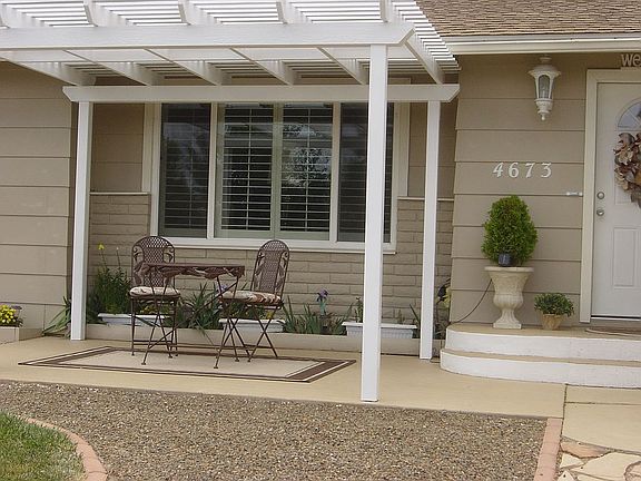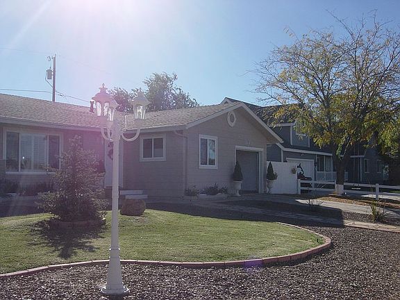 Completely refurbished immaculate interior with many upgrades including recessed lighting, skylights, stone tile flooring & granite counter tops with all stainless steel appliances including trash compactor. Smart thermostat. Separate laundry room with deep sink. Private entrance to one bedroom. Dual pane vinyl windows throughout. Plantation shutters. Split floor plan with walk in closet in master. Raised flagstone fireplace. Complete privacy fencing with no maintenance vinyl in back yard. Vinyl split rail fencing in front. Pergola covering front porch. Fenced raised garden beds and fruit trees in side yard and all under drip system. All lawn and grounds under a timed irrigation system. Large rose garden with fountain. Artificial grass in front yard. Three lantern light on timer in back and front. Large covered patio with fan and lights. Outdoor propane fireplace. Lawn area in back and front. New front lawn maintenance and water free. Two sheds in back yard with electric. One is insulated and carpeted. Many trees. New roof on house, patio and both sheds. New four car driveway and flagstone walkways. Solar system for reduced electricity.