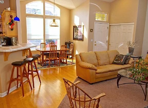 Gorgeous commonwall-style home in move-in condition, with soaring vaulted ceilings and walls of windows. "Great room" style living. Hdwd (maple) floors in entry, DR and kitchen; main level master w/cork floor, walk-in closet & slider to private patio; spacious bonus room & office nook upstairs, w/storage. Just around the corner from Bethany Village's shops and restaurants.