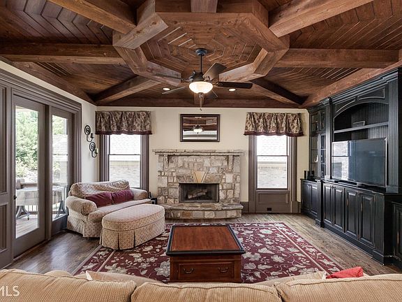 - Interior: Foyer - Entrance, Cable TV Connections, Ceilings - Vaulted, Ceilings 9 Ft Plus, Double Vanity, Gas Logs, Pulldown Attic Stairs, Separate Shower, Walk-in Closet, Whirlpool Bath, Bookcases, Garden Tub, Ceilings - Trey, Hardwood Floors, Wet Bar, Exposed Beams, Foyer - 2 Story