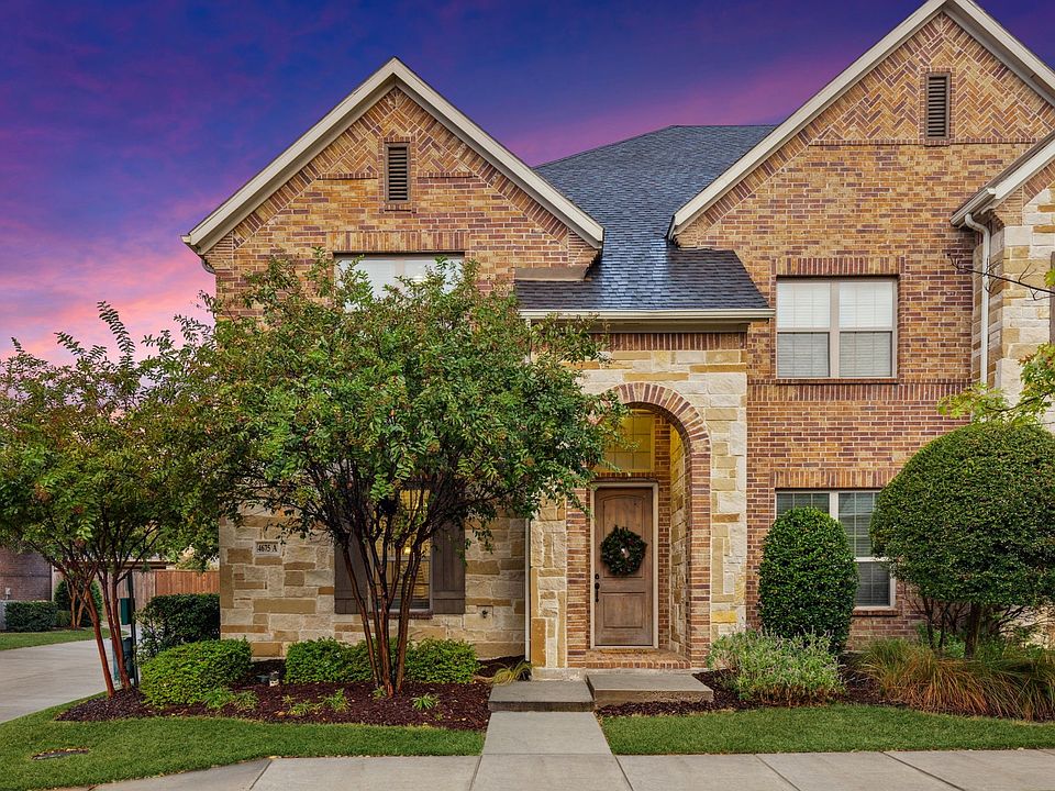 Beautifully landscaped corner unit townhome in the master planned Mustang Park community of Carrollton. Warm cream walls with crisp white trim, cool gray engineered wood flooring in common areas, plush gray carpeting in bedroom areas, and ceramic tile in wet areas. Kitchen features custom white cabinetry with brushed nickel hardware, stainless steel appliances, built in microwave, slate tile backsplash, black granite counters, island breakfast bar, and a walk in pantry open to the dining and living room. Primary bedroom upstairs with vaulted ceiling and fan. Separate vanities, ample cabinet space, bronze & dark hardware, decorative lighting over rich wood framed mirrors, ornately tiled steam shower, linen closet, and walk in closet. Cozy family room loft, 2 additional bedrooms, and one bath upstairs. Quaint office nook and half bath downstairs. 2 community pools with pergolas and patio space, entertainment pavilion, a community center with lounge area, fireplace, and fitness center, 3 sparkling ponds with fountains, lush greenbelts, and walking paths. New microwave installed 2024. Neighborhood features a community pool, green spaces, ponds, and walking trails. Mustang Park is quiet and tucked away from commercial areas, yet has quick access to Dallas North Tollway and George Bush Highway, making for easy commutes.