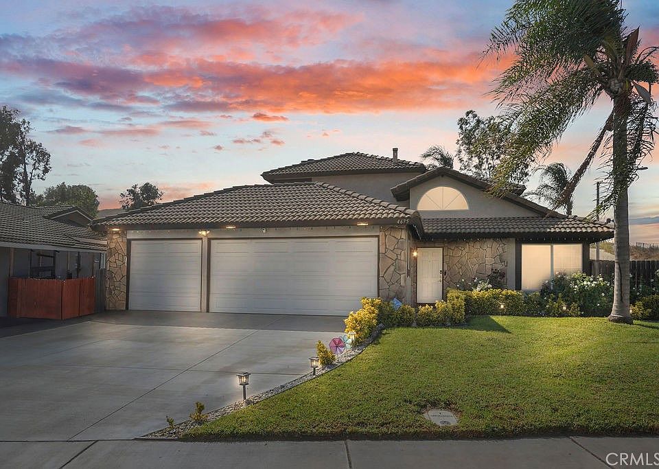Here is an opportunity to own this beautiful two-story home in Jurupa Valley's hills with views of the valley and the mountains. The floorplan offers a first-level living room and dining room with cathedral ceilings, a kitchen that opens into the family room with a fireplace, and a downstairs bedroom and bath. The kitchen has granite countertops, a glass tile backsplash, and stainless steel appliances. The upstairs offers a primary bedroom with an en suite bathroom that has dual vanities, two nice-sized bedrooms, and a hall bath. Other great features include plenty of driveway parking, a 3-car garage, and a covered patio. Ideal location near major employment centers, downtown Riverside, the Ontario International Airport, and freeway access to the 60, 15, and 215 freeways. Hurry, this one will sell fast!