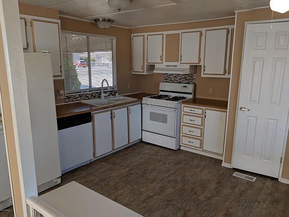 Beautifully updated 1982 manufactured home. 855 sq. foot 2 bedroom & 1 full bath. Updated interior from top to bottom. New carpet, paint, flooring, light fixtures. Nice large kitchen/dining area with refrigerator, dishwasher and gas stove. New water heater. 12x7 covered back patio. Circular driveway. Fenced back yard with 2 large side gates leading to back yard. Evaporative cooler and newer heater. Front deck/entry. Exterior has new paint as well as the sheds. Larger .18 lot with two storage sheds (oversized height 12x12 and 9x7).