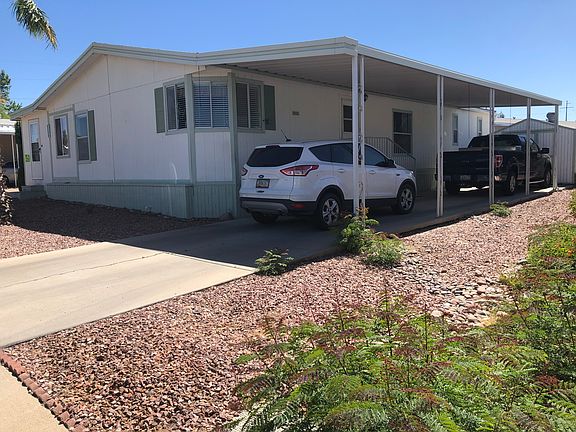 Beautiful, well-kept 2 bed, 2 bath double-wide home located in a Family community. • 2 Bedrooms (Walk-in closets in both bedrooms) • 2 Bath (Master bath has dual sinks, linen closet, walk-in shower and garden tub) • Den with built-in desk, cabinets, shelving • Formal dining room with bay window • Fully enclosed Arizona room with dual pane windows and window air conditioner) • Built-in trash/recycling bins • Covered patio with sunscreen • Fenced back yard • Separate laundry room with cabinets • 2 car tandem carport • Shed with power • Automatic bubblers to 4 Citrus trees and Cypress trees • Washer and dryer do convey • New in 2018! o Roof, Air conditioner, water heater, countertop microwave • New in 2019! o Self-cleaning 5 burner gas range, dishwasher, 21 cf refrigerator with ice/water in door, glass interior shelving • Home sits on an oversized lot Park amenities include 3 pools (2 heated year round), spa, playground, tennis/pickle ball courts, dog park, clubhouse with exercise room, and much more. *Utilities and monthly Lot Rent are separate*. Park approval is needed.