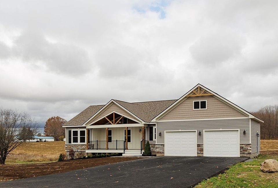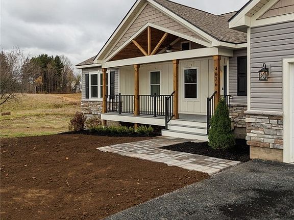 Stunning new build in Lacona, New York! One of the region's premier builders went above and beyond on this spectacular 3 bed, 2 bath home. Designed for modern living, with an exceptional floor plan accentuated by upgrades at every turn. A custom tile en-suite primary bathroom, engineered hardwood, granite countertops, and artisan stone and timber accents throughout the interior and exterior. Open concept living/kitchen/dining space with ample natural light and access to one of two composite porches with tongue and groove ceilings. Attached two-stall garage and central AC provide comfort through all four North-Country seasons, with a high-efficiency furnace and LED adjustable lighting throughout to keep your power bill low. If you need more space, there is 1,000+/- Sq Ft of unfinished basement space with a walkout sliding glass door ready to be finished. Nestled in an idyllic country setting, this home is sure to make the perfect primary residence or vacation getaway for the lucky buyer. Don't wait, call or text today to schedule a private viewing.