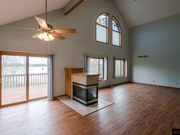 Hello lake property, hello summer! This expansive home boasts 3+ large bedrooms, 3 bathrooms, and soaring vaulted ceiling views of 100 feet of beautiful Middle Jefferson lake shore. As you enter the home you are greeted by an open concept kitchen and dining area with modern updates including Cambria kitchen countertops, DuraCeramic flooring and convenient half bathroom just off of the service door entrance to the garage. The dining space opens up to a spacious main floor living room with updated engineered hardwood flooring and two story windows with power activated window coverings at the very top for ease of use! Two sided gas fireplace is shared between the dining space and living room to cozy up the space and convenient patio door access takes you to an enormous wrap-around deck. Main level hosts 2 bedrooms and a large full bathroom complete with tile walk-in shower. Bonus loft space overlooks the living room for a fun 'birds eye view' of the main level. Downstairs you will find even more living space including family room, 3rd bedroom, 4th bedroom potential as egress is already installed, ¾ bathroom, and a tremendous amount of storage. Charming water feature, 1 acre lot, garage is finished and heated, new windows in the basement family room - move right in and enjoy this fantastic lake home.