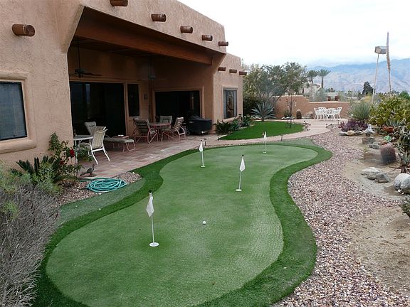Huge price reduction! Fabulous single level, 3,650 square feet, 3 + optional bedroom, 3 bath with panoramic mountain views. Located in the exclusive gated community of Rams Hill on the 8th fairway of the highly rated Tom Fazio Golf Course. Spacious rooms, master and two bedrooms on one wing with separate optional 4th bedroom, covered outdoor terrace, putting green, and views of the Santa Rosa mountains. Exceptional value!