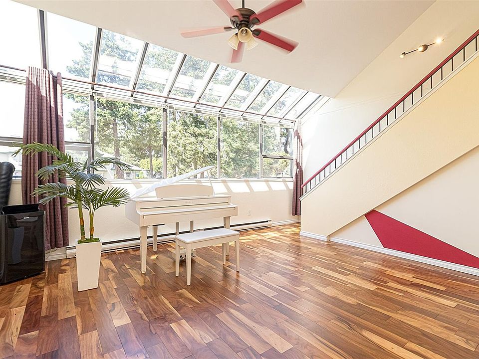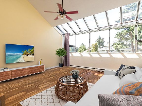 This bright and beautifully appointed 2 bedroom, 2 bath condo offers a perfect blend of comfort and convenience. Soaring vaulted ceilings and expansive windows fill the home with natural light, while modern finishings and rich wood floors create a warm, contemporary feel. The open layout is ideal for both everyday living and entertaining. Situated in a quiet, well-managed complex, you’re just minutes from Elk/Beaver Lake Park, Commonwealth Recreation Centre, and the shops and services of Royal Oak and Broadmead. Strata fees include heat, electricity, water, and parking—offering exceptional value and peace of mind. A rare opportunity to enjoy a move-in ready home in a highly desirable location with every amenity at your doorstep. Cats are allowed.