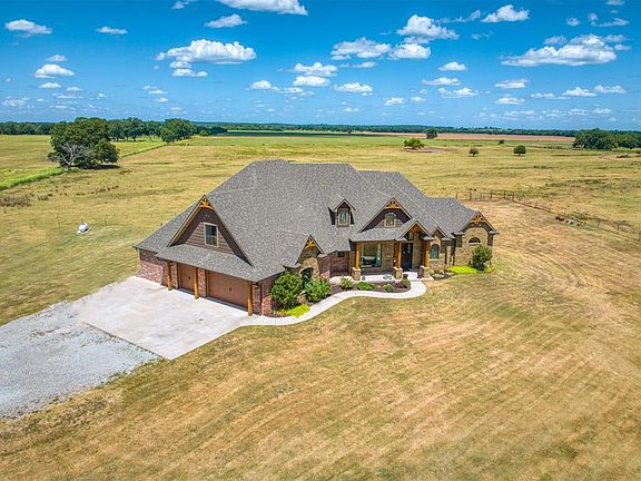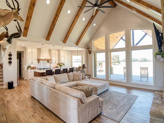 Upon entering, you’ll be in awe of the soaring ceilings and abundant windows that fill the spacious living area with natural light. The living room features a stunning fireplace made of authentic Oklahoma stone, creating a warm and inviting atmosphere.