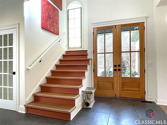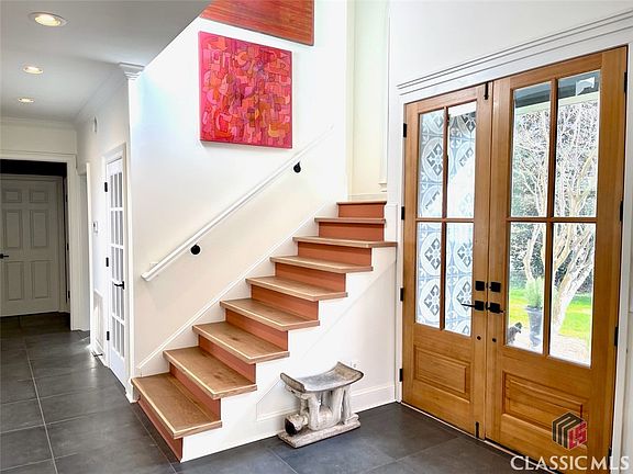 The 4700 sqft custom home was built in the late 90s and sits on 7.4 acres in the beautiful rolling countryside of southeast Athens Clarke County bordering Oconee to the south and just west of Oglethorpe. Down the picturesque circular drive, the house, hidden from the road in its own park-like setting exudes exclusivity all while being playful and approachable. The original owners were generous in their landscaping with now mature varieties of Japanese maples, pines, magnolias, crepe myrtles, river birch, and many more.