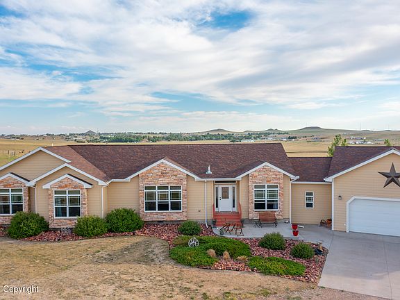 Wyoming welcomes you to over 20 acres of custom home that is the essence of country living! Large spacious floor-plan with new flooring and paint throughout, all on one level offers you 4 beds, 2.5 baths, a large master suite with a bathroom as large as the bedroom. Natural light floods this home in all the rooms, take advantage of the gorgeous Wyoming sunsets by viewing them from the kitchen or back patio under the pergola! Property is horse/animal ready, completely fenced. Heated garage offers 220V. Outbuildings include 40x30 shop, 16x60 RV building, and loafing shed/barn. Well is private, and property has NO COVENANTS.