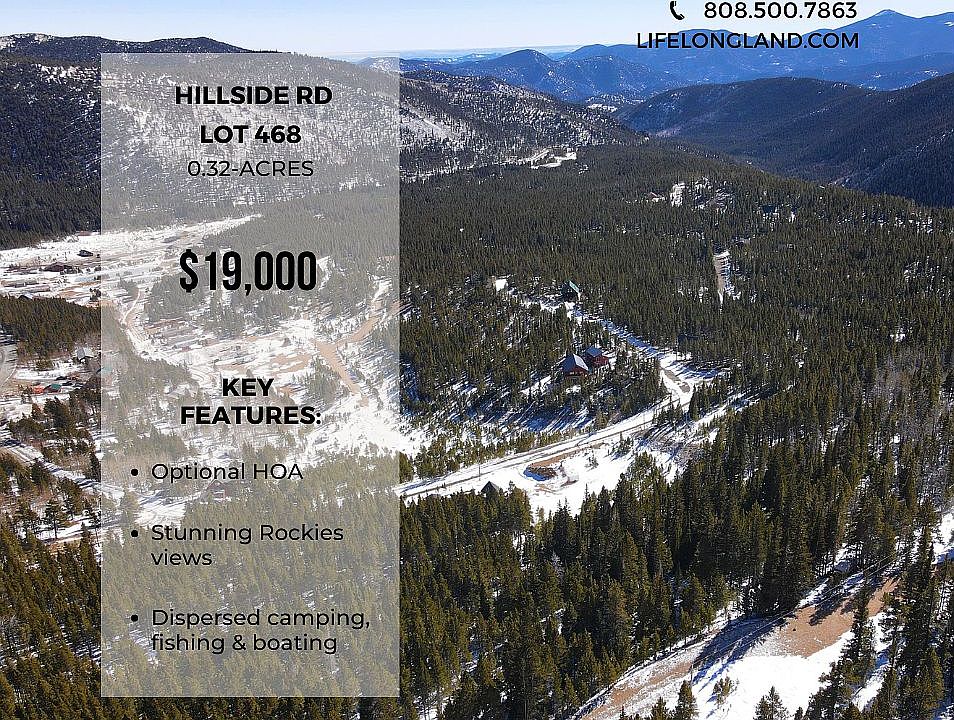 The St. Mary’s subdivision is a sought-after community and our properties are the lowest priced in the area - this is a rare opportunity! - LEGAL DESCRIPTION: SAINT MARYS SUBDIVISION Lot: 468 U3 - LOT: Lot 468 - ELEVATION: Approx 10,500 ft - ROAD ACCESS: Each property within the subdivision has maintained frontage to county-maintained roads - LOT SIZE: 0.32-acres - ANNUAL TAXES: $153.56 Hillside Road Lot 468 is a 0.32-acre property in the St. Mary’s subdivision in Idaho Springs, Colorado. The property sits at an approximate elevation of 10,538ft and boasts the potential to have amazing views of the surrounding mountains with the removal of some trees. The property is sloped at an approximate 40-degree angle which is ideal for maximizing view potential to the south and west side of the property. Hillside Road lot 468 is a corner lot located where Kingston Peak Trail meets Hillside Road and is heavily wooded with mostly Pine and Blue Spruce Trees with some Birch trees included as well. The area is filled with well-established homes and respectful homeowners who take excellent care of their piece of paradise.