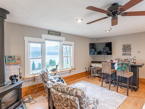 Welcome to Burns Lake.  This 128 Acre lake is a  peaceful place that does not have many homes surrounding it.  You have direct access from your back yard to a dock where you can enjoy swimming, kayaking, boating and fishing or simply sit back in a chair and take it all in.  Imagine how relaxing it would be to sit on your back deck overlooking this Lake and hearing the Loons go by.  Inside the home is a well cared for 3 bedroom 2 bath home with attached garage.  This home has wood floors throughout most of it.  First floor features large living room with gas fireplace and large windows overlooking the lake, another seating area inside to enjoy the view, large dining room, nice size kitchen with bar area, primary bedroom, ¾ bath and laundry area.  Upstairs you will find 2 good sized bedrooms, full bathroom and a nice landing area for a little more room.  Basement is where all the utilities are kept and good place for storage.  This home has undergone a lot of upgrades including new siding in 2023.  This location is convenient to Whitefield and Littleton.  Close to all the local golf courses, ski areas, hiking trails, great restaurants and breweries, shopping.  This home can be enjoyed in all four seasons.  Keep it for yourself or possibly let others use it as well.  You will be the home that all your friends and family want to come visit.  Please do not go to the property without an appointment.  Scheduled showings only.  People live here full time.