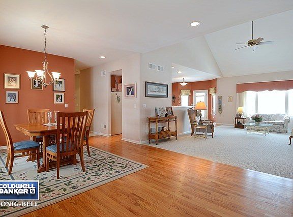 FANTASTIC NEW PRICE for lovely 3-BR home~Premium lot with large sunroom/den overlooking pond~Open floor plan w/many upgrades including hardwood flooring, volume/vaulted ceilings & recessed lighting~Spacious kitchen w/beautiful maple cabinetry w/crown molding, Corian counter tops & breakfast bar~Master suite w/private bath, maple raised vanity w/double sink, ceramic tile flooring & large walk-in closet~1st floor laundry w/utility sink~Full, English basement is partially finished w/half bath, separate storage room & large walk-in closet~Lovely landscape w/sprinkler system~Enjoy covered front porch, patio & deck w/gas grill~Beautiful scenic views of pond all year!