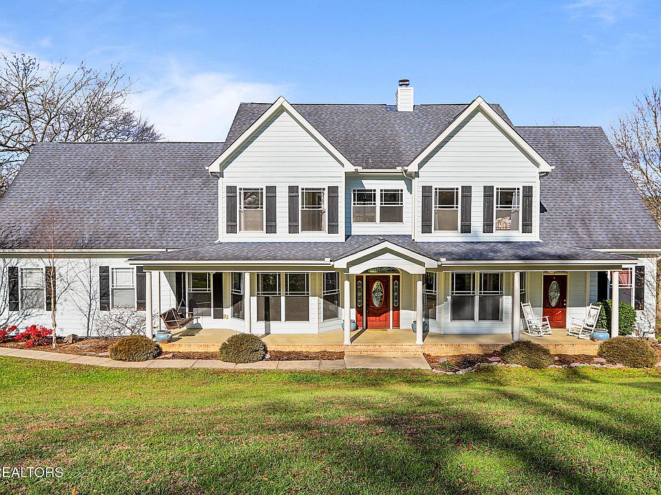 Introducing 4680 Luttrell | A meticulously maintained, custom-built farmhouse catering to those seeking quiet countryside living with exceptional proximity to local amenities. With timeless curb appeal, the home occupies 8.76 fully fenced and partially wooded acres, offering a generous 4,058 square feet of versatile living space. Main level living consists of a bright and airy two-story great room illuminated by a wall of windows, and anchored by a floor-to-ceiling wood-burning fireplace. A second story balcony/sitting area overlooks the living room, flooding the space with more natural light. The well-appointed open kitchen features barstool seating, tile backsplash, double ovens, a brand new cooktop and dishwasher, updated cabinetry, and stainless appliances. This space flows seamlessly into a breakfast nook and a formal dining room, striking an ideal balance between everyday living and entertainment. Additionally, the main level encompasses the spacious primary suite with an oversized tiled walk-in shower, dual shower heads, as well as a claw-foot tub with picture windows privately overlooking the rear of the property. The main-level home office with built-in shelving fosters a productive environment for those seeking a creative workspace. The oversized laundry hub boasts a laundry chute and mudroom, including built-in coat/shoe storage to optimally service utility needs. Pristine hardwood floors throughout ensure long lasting durability. The upper level features brand new carpet, a designated theater room wired for speakers, three generously sized secondary bedrooms, and a versatile flex room that can serve as an additional 5th bedroom or gaming/media area. A balcony sitting area enhances the home's open, airy feel. Thoughtfully designed, every inch of this home maximizes storage and practicality. Outdoor living is equally enticing, with a porch spanning the front of the home, an expansive rear deck with a swinging daybed overlooking the pastoral property, and a screened-in porch. The stone fire pit and picnic pad extends your relaxation and invites gathering around to soak in the beauty of this unparalleled offering. Adding to the property's charm and functionality is a fully equipped chicken coop, ideal for those looking to embrace a more self-sustainable lifestyle. The property's acreage offers a mix of open fields and semi-wooded areas teeming with wildlife. The lower level HVAC was installed new in 2018, and the upper level HVAC was installed new in 2022. This home is highly energy-efficient, with average electric bills throughout the year of $216, and $39 for water. Virtual staging used for some photos to illustrate room size. This property is truly a rare gem and must be experienced in person - 4680 Luttrell awaits your private tour. Buyers are advised to verify all essential details in real estate transactions. Contact your preferred agent today to schedule a viewing.