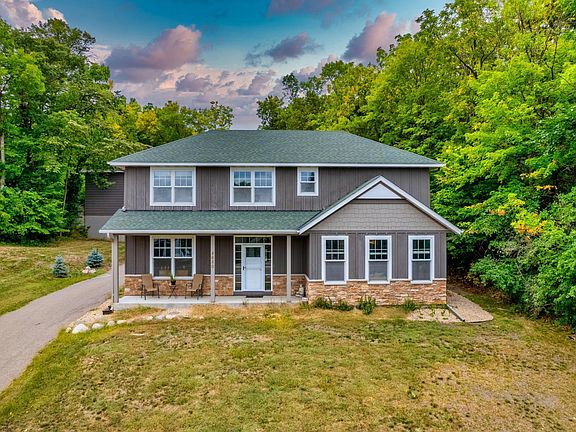 ONE OWNER HOME. FOUR BEDROOM UP TWO STORY WITH UPPER LEVEL LAUNDRY. OWNERS BEDROOM HAS GAS FIREPLACE + DELUXE WHIRLPOOL BATH & SEPARATE SHOWER. GRANITE ISLAND KITCHEN WITH PANTRY. FINISHED LOWER LEVEL THEATER ROOM WITH 3/4 BATH AND STORAGE. TWO STORY ENTRY WITH LOFT FACING THE LAKE ACROSS THE STREET. THIS PROPERTY HAS A RARE DETACHED SUPER GARAGE. FOUR CARS WIDE THREE STORIES HIGH. 2700 SQ FT ALL ON PRIVATE 1/2 ACRE WITH NO CLOSE NEIGHBORS. EASY ACCESS TO HWY 12 BYPASS OPTIONAL ORONO SCHOOL BUS STOP TWO BLOCKS AWAY AT SAGA HILL. Big 30 ACRE PARK VERY CLOSE WITH WALKING TRAILS. Assumable CD terms.