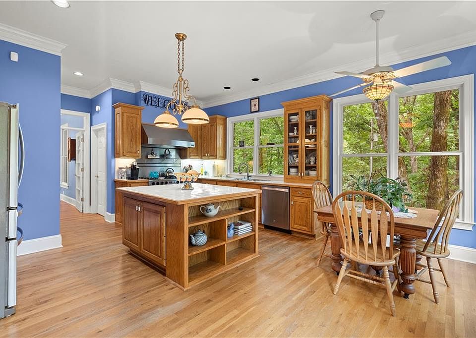 - Features: Cabinets Stain, Country Kitchen, Eat-in Kitchen, Kitchen Island, Tile Counters