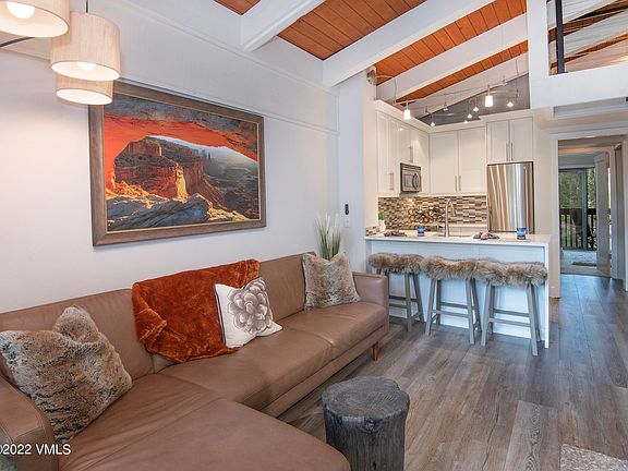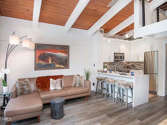 Be ready for ski season in style in this chic top floor 1 bedroom, plus loft that features vaulted ceilings, a large skylight and loads of natural sun light. Wake up to sunrise views to the East and wind down to sunset views to the West. A fabulous new stone floor to ceiling, gas fireplace provides for cozy and comfortable ambiance throughout the seasons. The updates include a nicely appointed kitchen with quartz counter tops and a water fall edge; both baths have been updated with new vanities and sinks, and the full bath has new shower tile and glass sliding doors. New wide plank luxury vinyl floors and new steel wire railing in the loft enhance the seamless modern meets mountain design. The buildings in VRC all recently underwent extensive exterior renovations including new stairways, front and back decks, and new roofs. A convenient location, this residence is just steps to the clubhouse amenities, outdoor pool and free Town of Vail bus stop, and a short walk to East Vail's Bighorn Park. Vail Racquet Club is ideal for those seeking low maintenance resort living complete with a current fitness center, tennis courts, year round outdoor pool, hot tubs, bike storage and more!