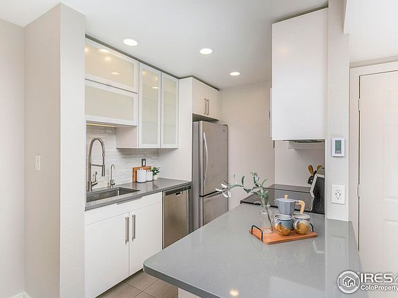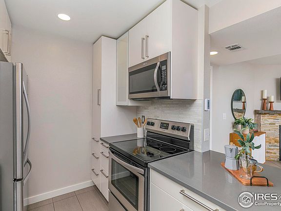 We think it's the best unit in Hunter Creek! Bright and beautifully remodeled with sensible and stylish upgrades including USB power outlets in each room, Ecobee remote access thermostat, over the air digital TV and keyless entry. Completely redesigned kitchen with all new cabinets, appliances and plenty of cabinet space. Accent lighting, designer tile backsplash and fixtures, water dispenser and quartz countertops. Keep those feet warm with heated tile floors in the kitchen & bathrooms. Luxury vinyl flooring with carpet in the bedrooms. Beautiful custom gas fireplace with stone surround and custom mantel. Stylish bathrooms vanities with convenient lighted mirrors, medicine cabinets, new toilets, designer tile and glass shower doors. Large primary suite with large walk-in closet and private bath. This condo has it all, noise insulated ceilings, custom closet shelving and there is a newer stackable HE washer/dryer, new hot water heater and newer furnace. Topping it all off with new trim, doors and paint making it the perfect place to call home! 1 reserved carport and 1 reserved parking space near the unit. Hunter Creek residents enjoy the on-site pool, clubhouse, gym, adjacent to large community park/trails and tennis courts. Blocks to both Avery Brewing and Celestial Seasonings. RTD bus stop one block away with easy access to all that The City of Boulder has to offer including CU. YOU WON'T BE DISAPPOINTED!