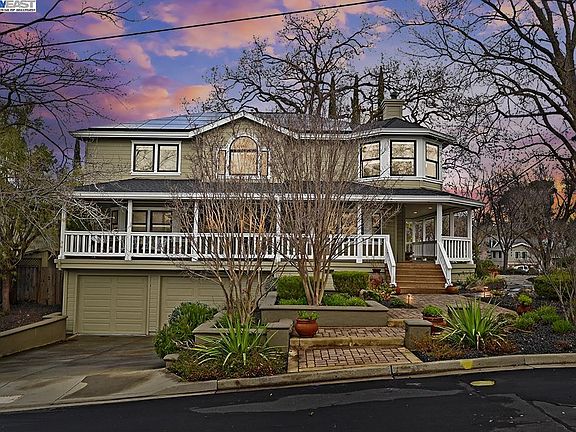Prime Downtown Pleasanton Location! Modern Victorian Home with high quality fixtures & finishes. 4 bedrooms plus office & basement bonus room with kitchenette & full bathroom. Gourmet kitchen with stainless steel appliances & solid surface counter tops. Eat-in kitchen with breakfast bar, walk-in pantry, island with gas cook-top, & wine fridge. Travertine tile throughout main level of home. Custom crown moulding & baseboard in every room. New interior paint. Updated light fixtures throughout. Owned solar system. Surround sound system with ceiling speakers throughout. Pella windows with built-in shades & French doors. Office with custom built-in cabinets. Primary suite with oversized sitting area, windows with views of the ridge, walk-in closet. Primary bathroom with jacuzzi tub, gas fireplace, heated floors, & large shower with rain/massage features. Traditional wrap-around porch with solar sun shades, lighting, & outdoor ceiling fans. Basement media room with movie projector, surround sound, perfect for entertaining or possible in-law or au-pair suite. Could possibly be converted to JADU with City approval. Secluded backyard with paving stone courtyard & redwood deck with trellis. Walk to Downtown farmers market, concerts in the park, fine dining, cafes, shopping, and more!