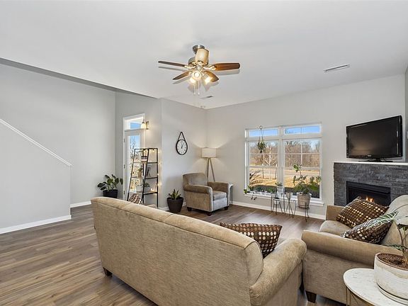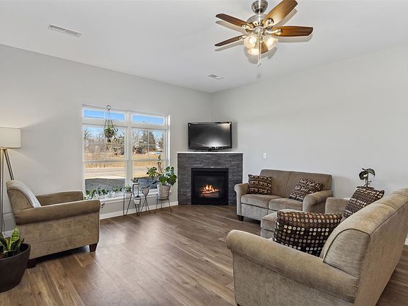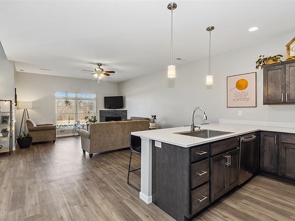 This lovely corner-unit town-home styled condo features three bedrooms and two-and-a-half bathrooms. Open floor plan main level with a modern kitchen featuring dark stained cabinetry, quartz countertops, stainless steel appliances, and a large peninsula with sink and breakfast bar overlooking the living/dining areas. A corner gas fireplace in the living room provides the perfect ambiance for relaxation. The main level also includes a powder room and a large walk-in closet beneath the staircase, providing ample storage space. As you make your way upstairs, the dramatic foyer with high ceilings and windows makes a lasting impression. The upper level features three bedrooms, including the primary suite with a trey ceiling detail, ensuite bath with double vanity, and large walk-in closet. Additionally, the upper level includes a laundry room and a second full bathroom. This condo has a two-car attached garage and is moments from a variety of Iowa City amenities, nature trails, and parks.
